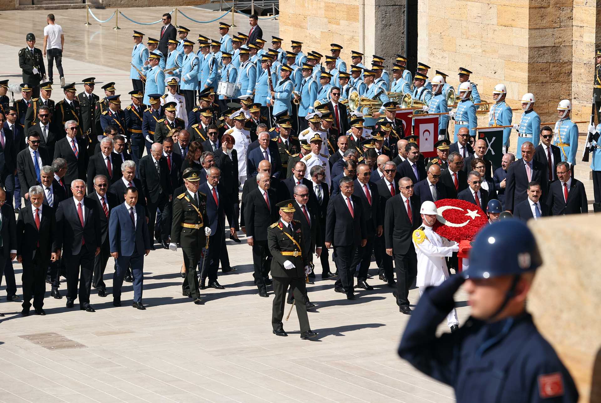 Cumhurbaşkanımız Sayın Recep Tayyip Erdoğan başkanlığındaki kortejde, TBMM Başkanı Mustafa Şentop, Cumhurbaşkanı Yardımcısı Fuat Oktay, siyasi parti liderleri, Cumhurbaşkanlığı Kabinesi üyeleri, yüksek yargı organlarının başkanları, komutanlar, siyasi partilerin temsilcileri, bürokratlar ve diğer devlet erkânı yer aldı.