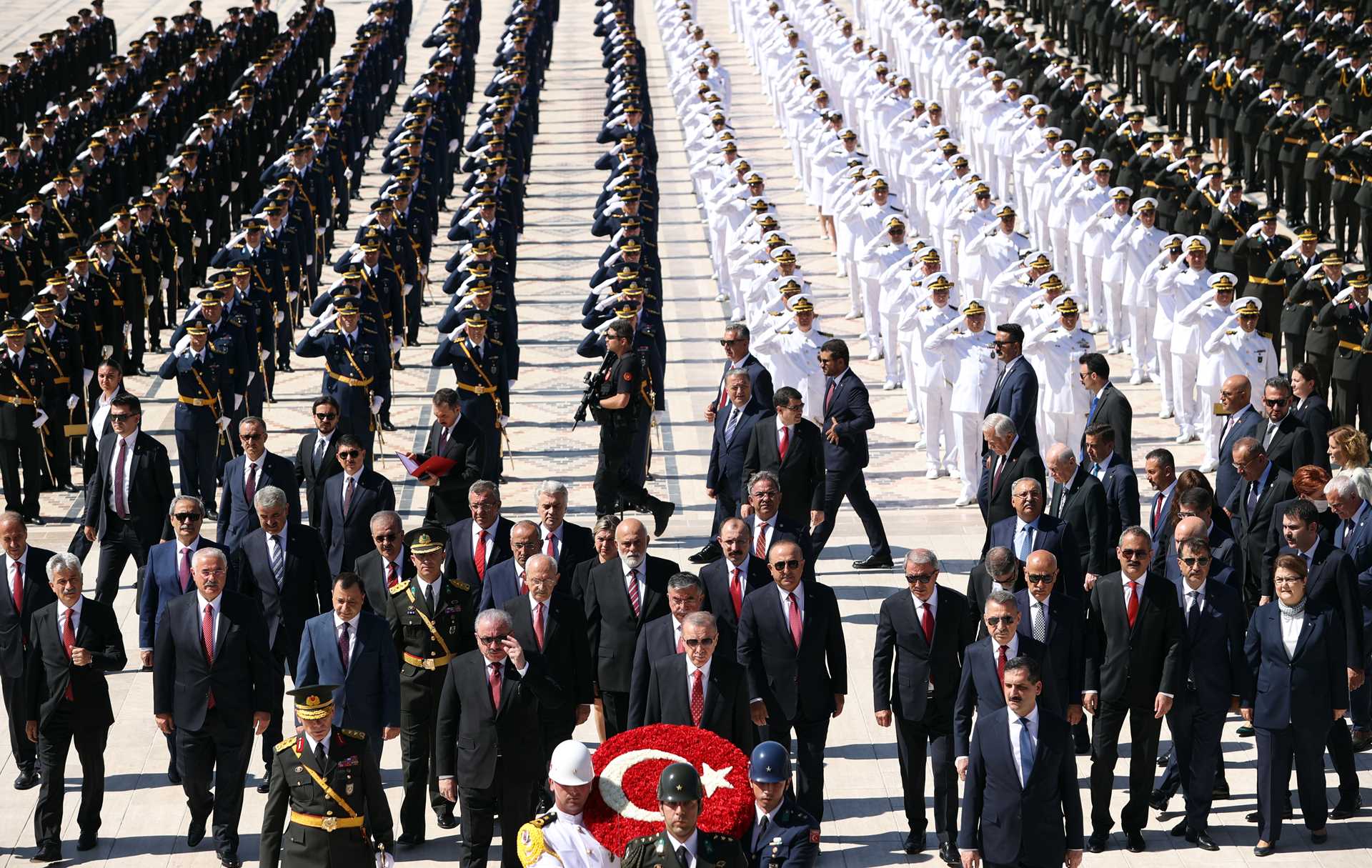 Cumhurbaşkanımız Sayın Erdoğan, törende Atatürk'ün mozolesine ay yıldız motifli çelengi bıraktı. Saygı duruşunun ardından İstiklal Marşı okundu.