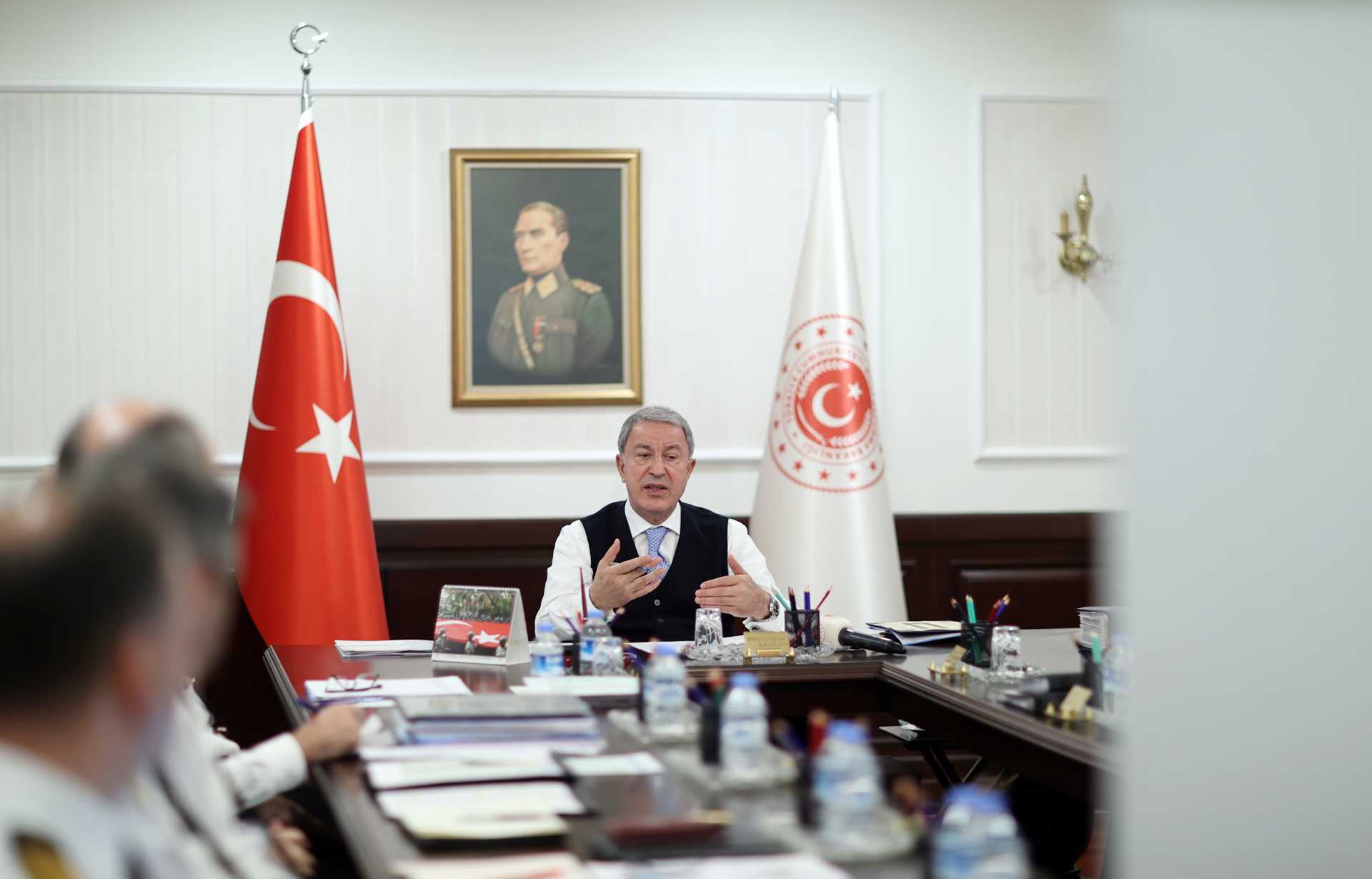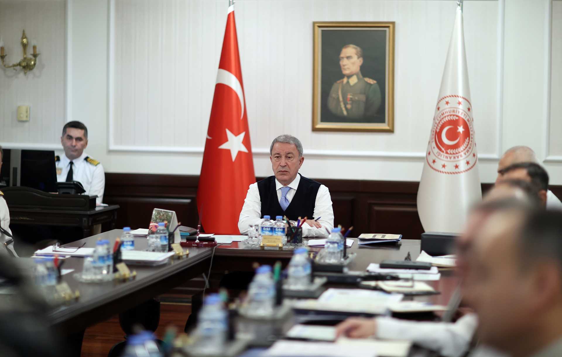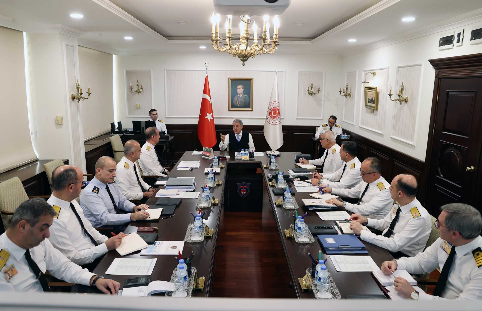 Yurt içi ve sınır ötesindeki birlik komutanlarının sahadaki son duruma ve çalışmalara ilişkin bilgi verdiği toplantıda talimatlar veren Bakan Akar, Deniz Kuvvetleri Komutanlığı Karargâhından katıldığı toplantıda savunma ve güvenlik konularına ilişkin de değerlendirmelerde bulundu.