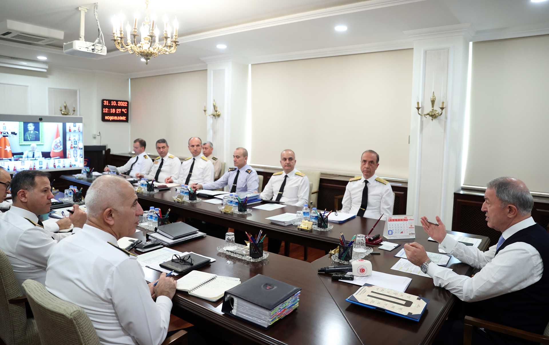 Tarih: 31.10.2022Millî Savunma Bakanı Hulusi Akar başkanlığında, Genelkurmay Başkanı Orgeneral Yaşar Güler, Kara Kuvvetleri Komutanı Orgeneral Musa Avsever, Deniz Kuvvetleri Komutanı Oramiral Ercüment Tatlıoğlu ve Hava Kuvvetleri Komutanı Orgeneral Atilla Gülan'ın katılımıyla video telekonferans toplantısı gerçekleştirildi.