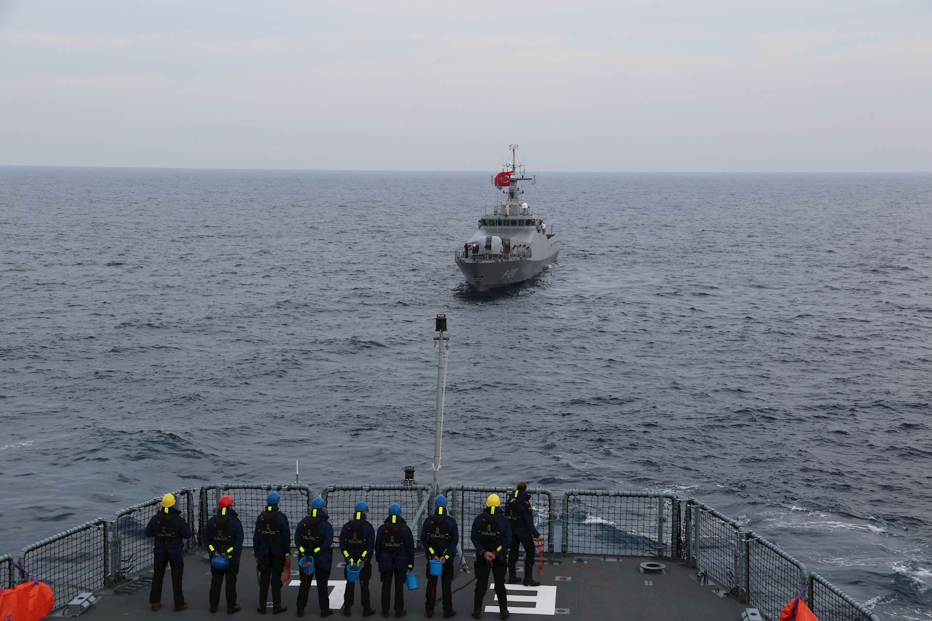 Tarih: 23.12.2025As part of Standing NATO Maritime Group 2 (SNMG2) mission, TCG Türkeli conducted maritime training with flagship FGS Elbe off the north of Chios.