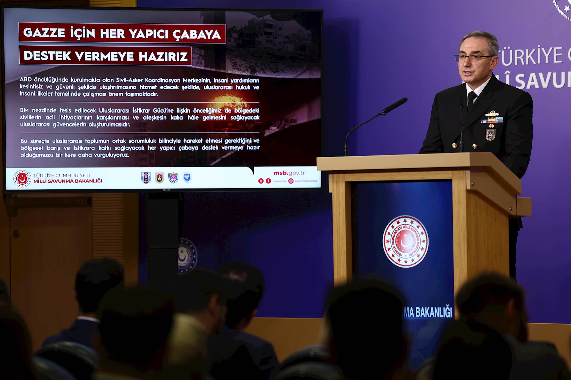 Birleşmiş Milletler nezdinde tesis edilecek Uluslararası İstikrar Gücü’ne ilişkin önceliğimiz de bölgedeki sivillerin acil ihtiyaçlarının karşılanması ve ateşkesin kalıcı hâle gelmesini sağlayacak uluslararası güvencelerin oluşturulmasıdır.
