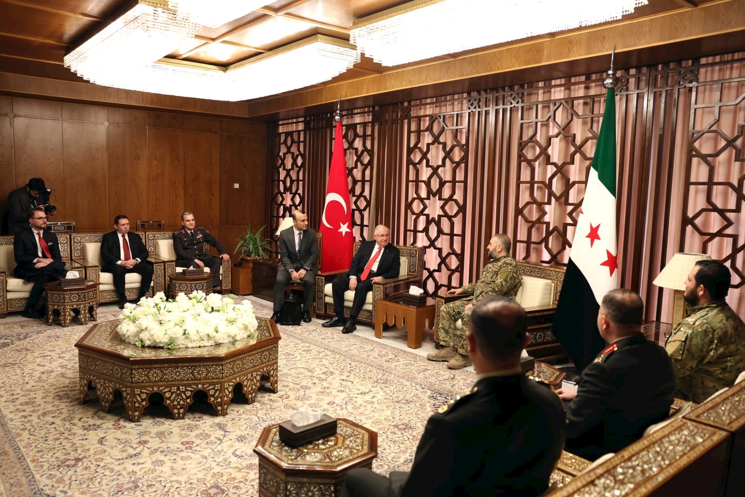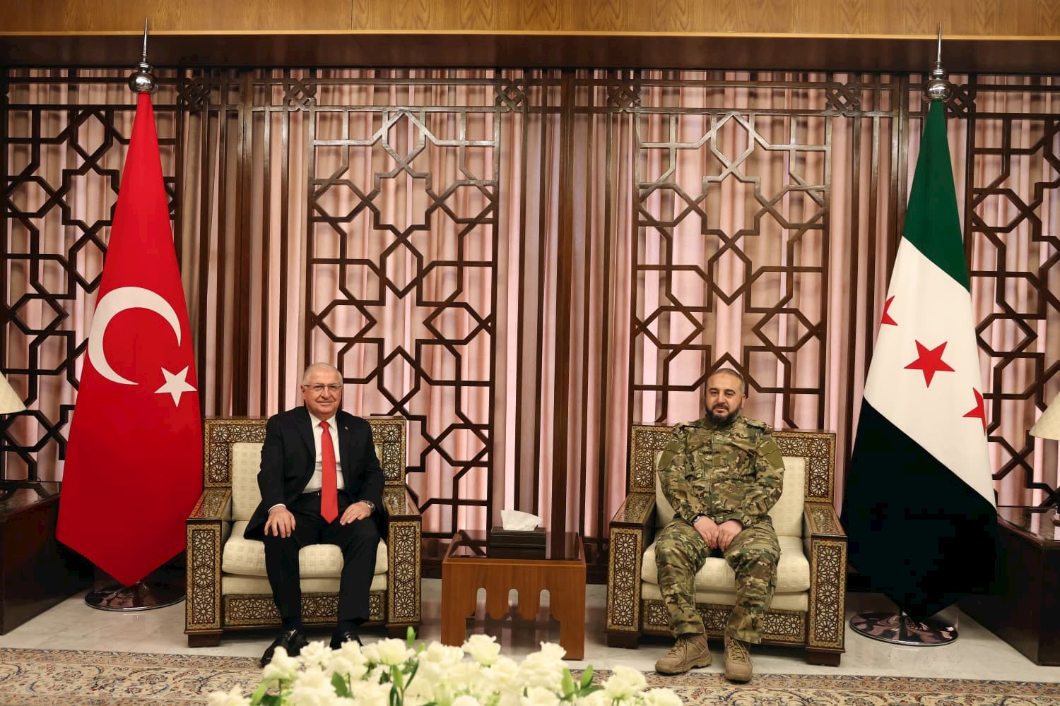 Tarih: 22.12.2025Millî Savunma Bakanı Yaşar Güler; Dışişleri Bakanı Hakan Fidan ve MİT Başkanı İbrahim Kalın ile Suriye’ye bir çalışma ziyareti gerçekleştiriyor. Bakan Yaşar Güler, Şam’da Suriye Savunma Bakanı Tümgeneral Murhaf Ebu Kasra tarafından karşılandı.