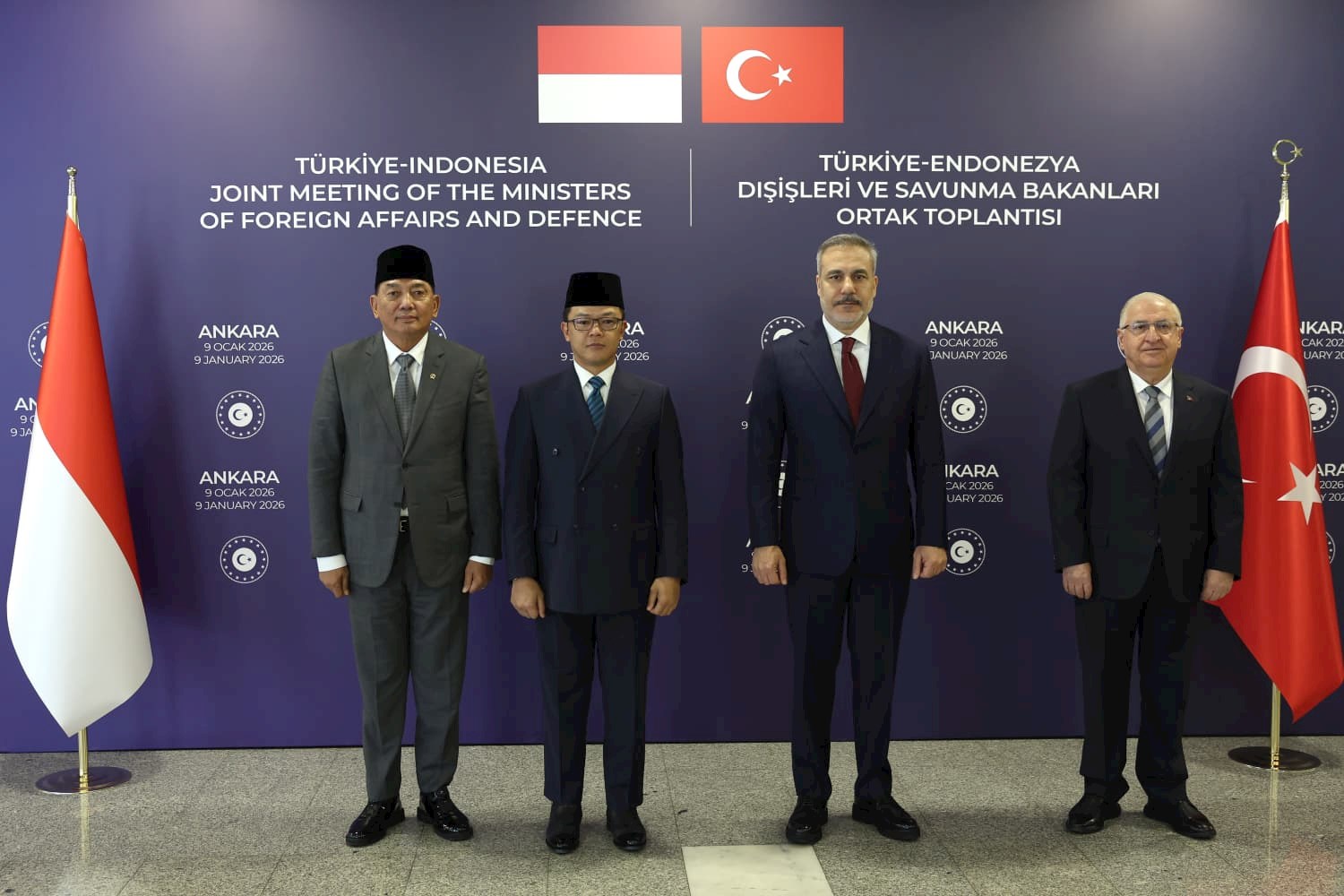 Tarih: 09.01.2026Millî Savunma Bakanı Yaşar Güler, Dışişleri Bakanı Hakan Fidan, Endonezya Dışişleri Bakanı Sugiono ve Endonezya Savunma Bakanı Sjafrie Sjamsoeddin’in katılımlarıyla "Türkiye-Endonezya Dışişleri ve Savunma Bakanları Ortak Toplantısı" Ankara’da gerçekleştirildi. Toplantıda Bakanların yanı sıra Genelkurmay Başkanı Orgeneral Selçuk Bayraktaroğlu ile Savunma Sanayii Başkanı Haluk Görgün de yer aldı.