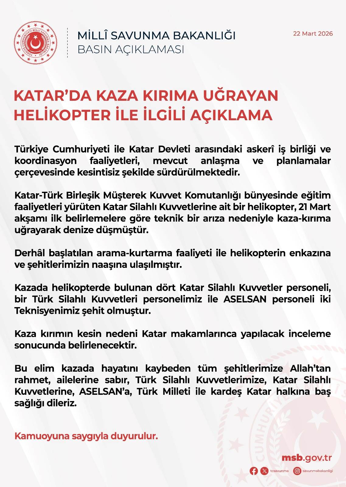 Bu elim kazada hayatını kaybeden tüm şehitlerimize Allah’tan rahmet, ailelerine sabır, Türk Silahlı Kuvvetlerimize, Katar Silahlı Kuvvetlerine, ASELSAN’a, Türk Milleti ile kardeş Katar halkına baş sağlığı dileriz.